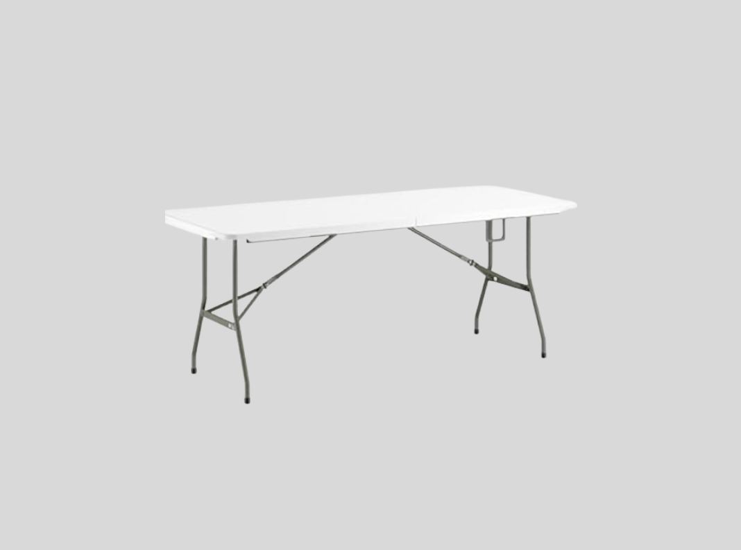The 30" x 72" White Plastic Bi-Folding Table is a versatile, heavy-duty option perfect for food service, gifts, or guest seating. It comfortably seats 6 to 8 people and folds for easy setup and transport.